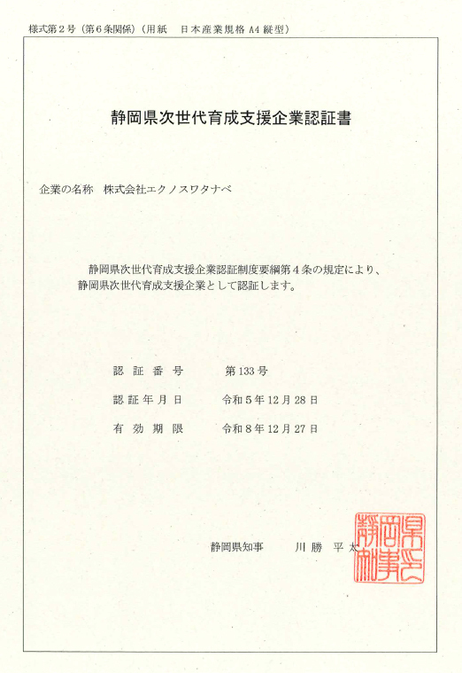 静岡県が実施する「こうのとりカンパニー」認証制度において、認証企業として認定されました。エクノスワタナベでは、育児休暇の取得促進や柔軟な勤務体制の整備など、仕事と家庭の両立支援に取り組んでおります。今後も、社員が安心して働き続けられる職場環境の整備に努めてまいります。